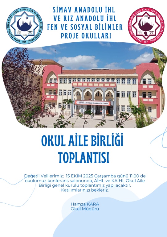 DEĞERLİ VELİLERİMİZ, 15 EKİM 2024 ÇARŞAMBA GÜNÜ 11.00'DE OKULUMUZ KONFERANS SALONUNDA, AİHL VE KAİHL OKUL AİLE BİRLİĞİ GENEL KURULU TOPLANTIMIZ YAPILACAKTIR. KATILIMLARINIZI BEKLERİZ.
